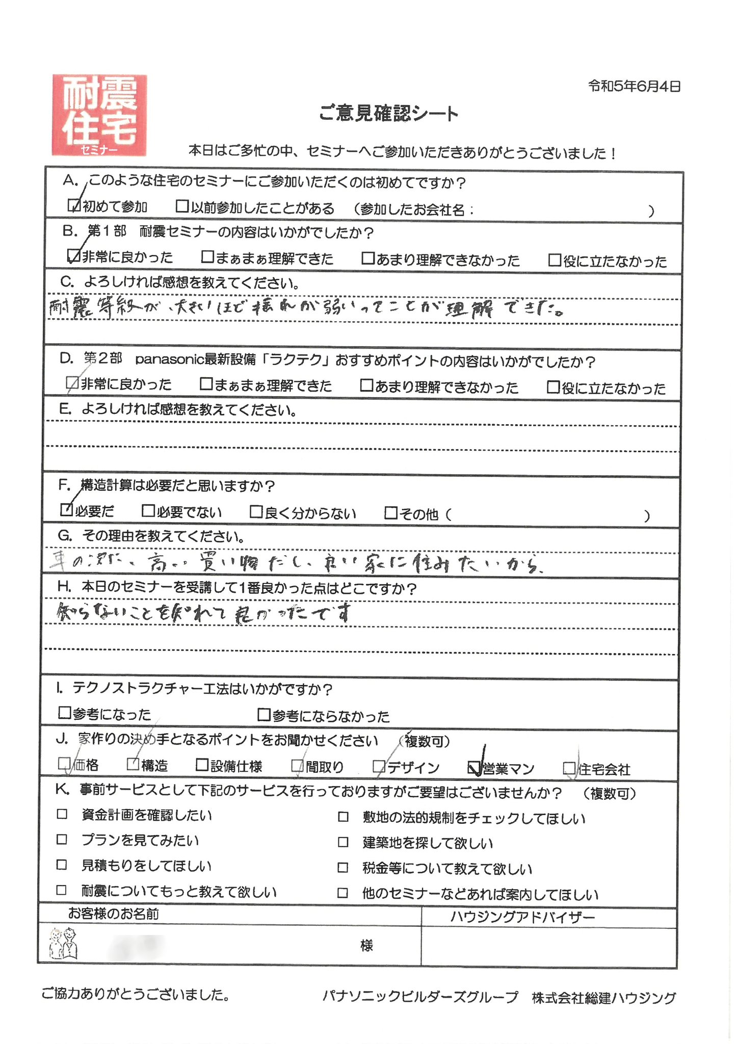 「このセミナーに参加して耐震住宅の具体的なイメージが出来た」