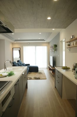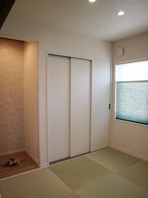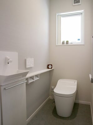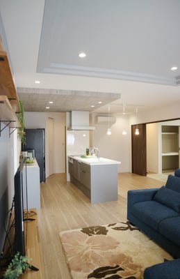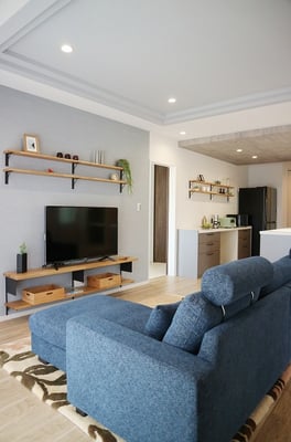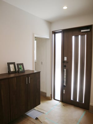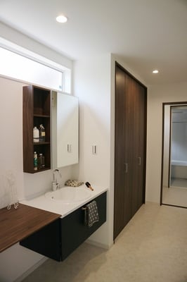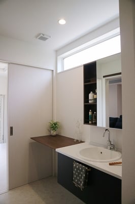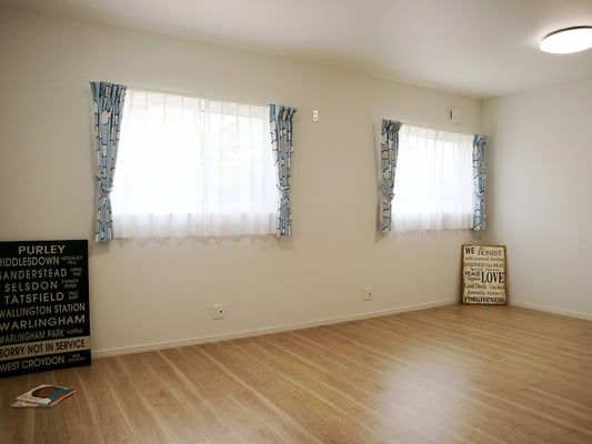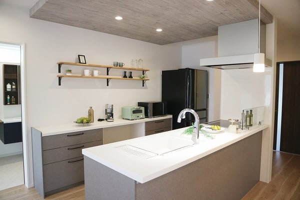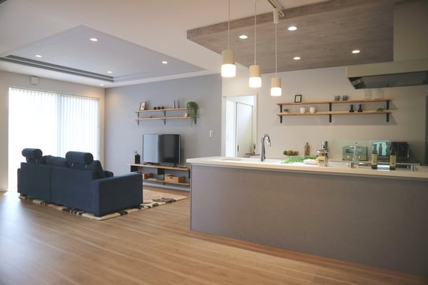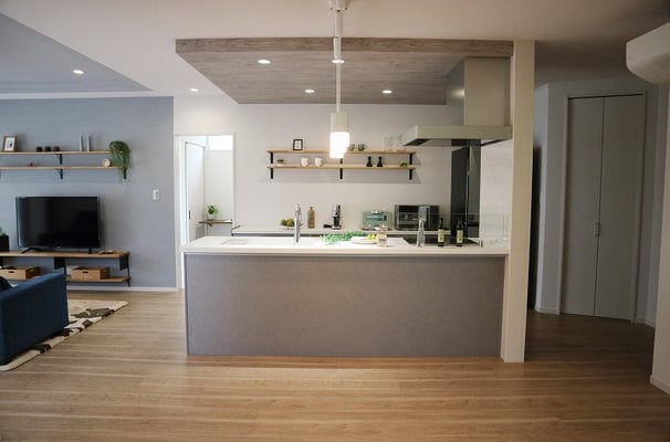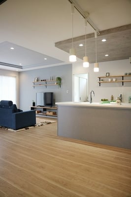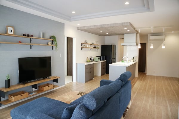 床面積37坪の平屋住宅で建てられた30代ご夫婦の家。お子様が小さい間はお部屋を区切らず、自由に遊べる大きな部屋として利用します。玄関やLDKには収納量たっぷりのストックルームやパントリーがあるので、使ったら片づけるの動作が身につくプランになっています。LDK天井は折り下げ天井や、2段天井を施し空間に奥行きが出るようになっています。