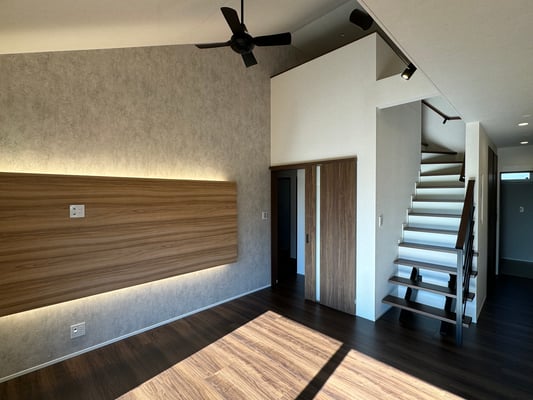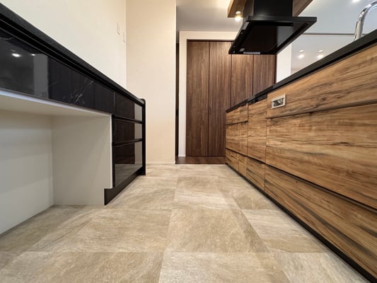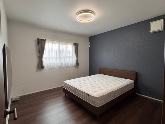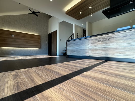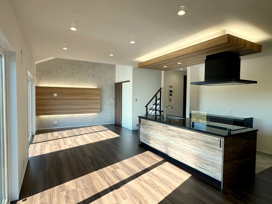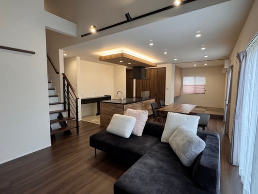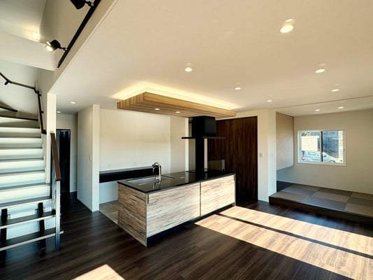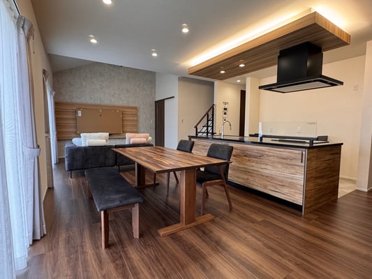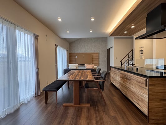 ダイニングとリビングが一体化した広々とした空間は、家族や友人が自然と集まり、笑顔があふれる場を作り出します。ウッド調の温かみあるフローリングと、キッチンのモダンなデザインが調和し、洗練された雰囲気を演出。また、大きな窓から差し込むたっぷりの自然光が、室内をさらに明るく快適にしています。