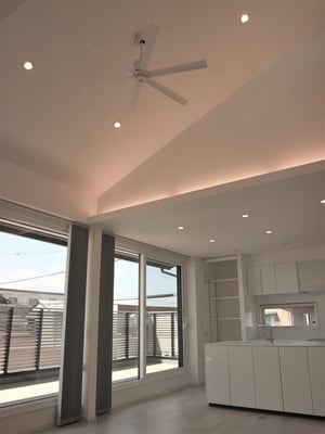 2階に居住スペースを配され、大きな開口部からLDKに光が降り注ぐ自慢の家です。バーチカルブラインドを開け放してもプライベートが守られるよう広々バルコニーにサッシ手すりを設けました。吹き抜けにはファンが回り、優雅にリラックスできるリビング。アイランドキッチンからは家族の気配が感じ取れる憩いの空間です。ご夫婦のこだわりを随所に取り入れました。