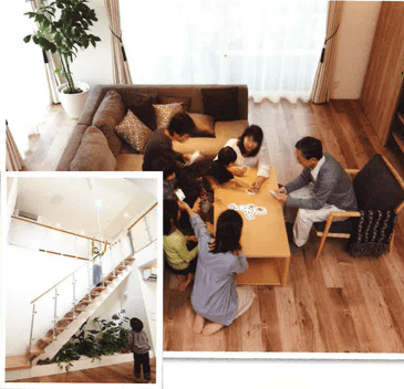 三世代が毎日食卓を囲み、団らんを楽しむ広びろしたリビング。吹き抜けが2階の子世帯ホールとのつながりも生み出しています。