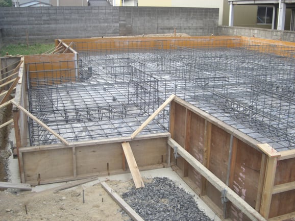 第三者の公的検査機関による配筋検査を行います。設計図書通りの位置、ピッチ(鉄筋と鉄筋の間隔)、本数など正しく鉄筋が配置されているか確認する検査です。