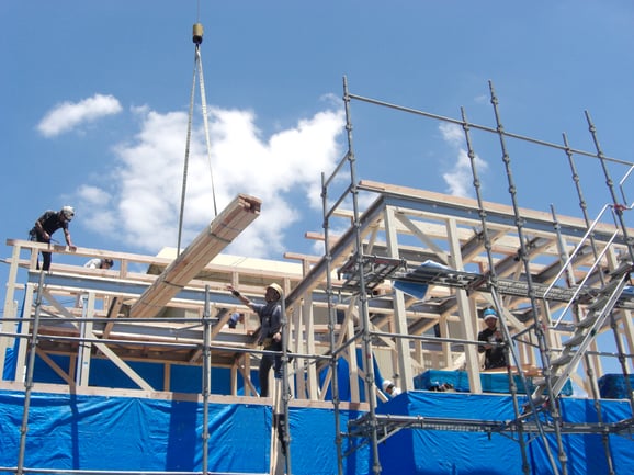 土台の上に柱を建て、梁を掛けて棟上げをします。建前(たてまえ)や棟上げ(むねあげ)とも呼ばれ、家づくりにおける重要な工程のひとつです。お客様の夢のマイホームが、カタチとなって見る第一歩です。