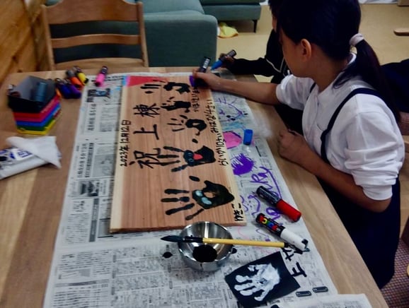 「お家でもっと描きたい」とお姉ちゃんを中心に記念に残る素敵な手形プレートに仕上げてくれました。