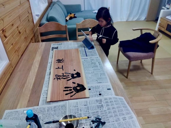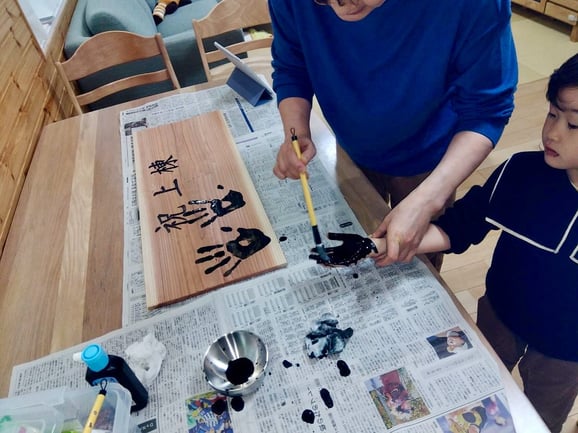 1番上のお姉ちゃんが学校から帰るのを待ち、みんなで墨汁で真っ黒の手に (笑)