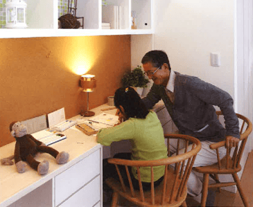 階段付近にはスタディコーナーを設置。子世帯からも目が行き届き、親世帯が2階を気軽に訪れ、一緒に遊んだり、勉強を教えたりできます。